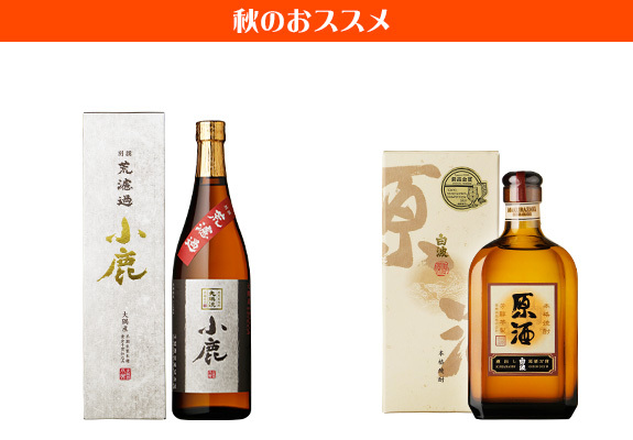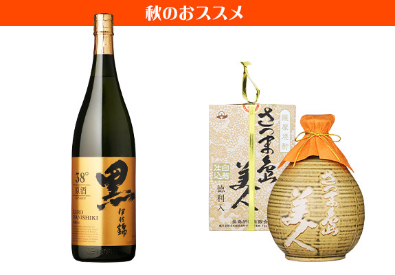 ☆秋のおススメ☆ 『秋の夜長に、じっくりと楽しみたい焼酎をご準備しました♪』 ・25% 別撰荒濾過小鹿 720ml ・37% 白波 原酒 720ml ・38% 黒伊佐錦 原酒 1800ml ・35% 島美人 徳利 720ml ・25% 薩摩六名所 限定 あわせ黒りえもん 900ml ・25% 伊佐美 1800ml ・25% 茶房 大海庵1800ml/720ml ・25% 喜界島荒濾過黒糖 1800ml |